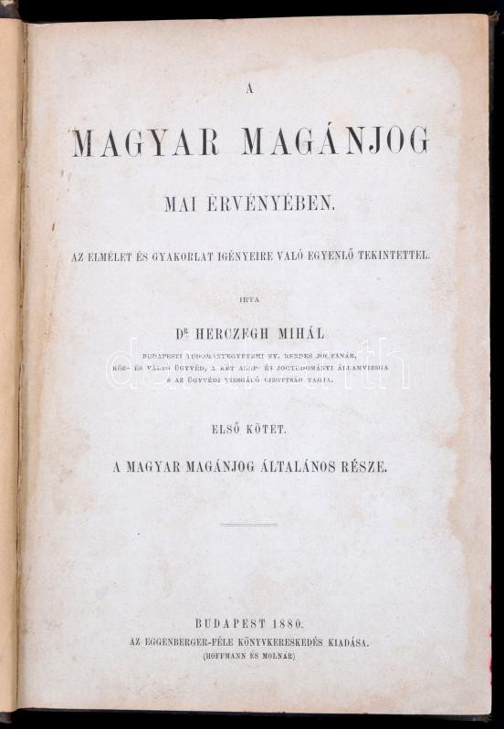 Dr. Herczeg Mihál: A magyar magánjog mai érvényében. Az elmélet és gyakorlat igényeire való egyenlő tekintettel. I. kötet: A magyar magánjog általános része. [Unicus, több kötete nem jelent meg.] Bp., 1880, Eggenberger,(Hoffmann és Molnár-ny.), 4+298+2 p. Későbbi átkötött aranyozott gerincű félvászon-kötés, festett lapélekkel, kopott borítóval, a gerincen apró sérüléssel, foltos lapszélekkel./ Half-linen-binding, with worn cover, with little damage on the spine, with some spotty on the edges of the pages. In Hungarian language.