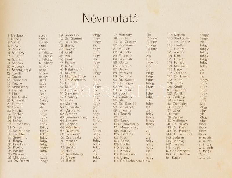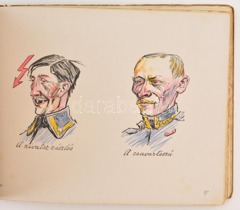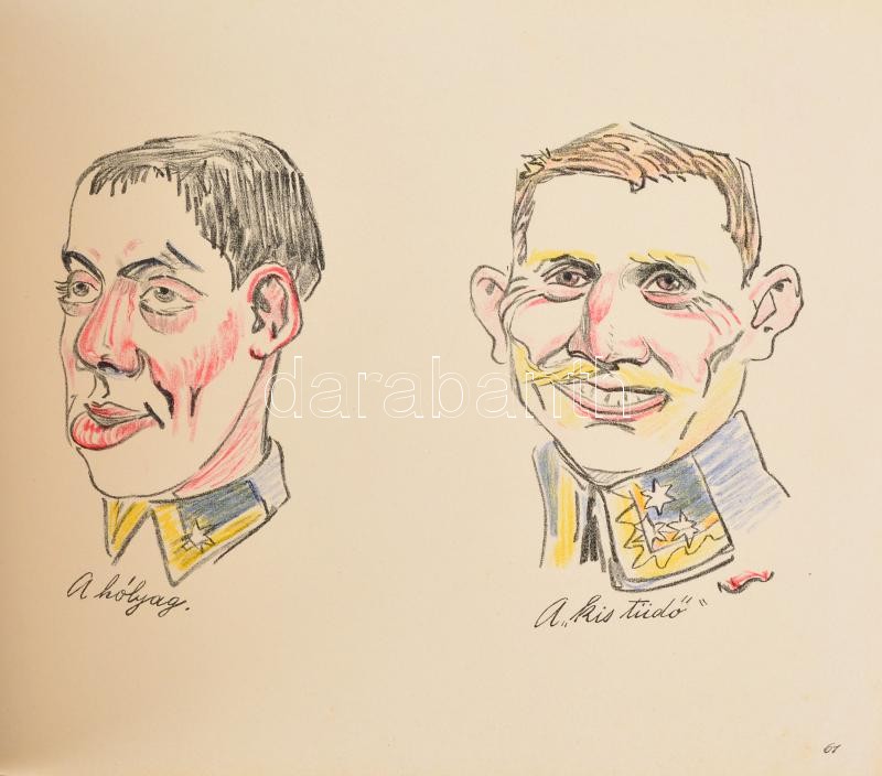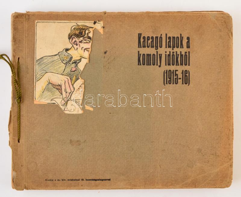 Kövér Gyula (Kövér Gyuszi) (1883-1950): Kacagó lapok a komoly időkből. (1915-1916.) Kiadja: M. Kir. Miskolci 10. Honvédgyalogezred. Bp.,(1917), Fénynyomda és Grafikai Műintézet, 4 p.+76 t. Haránt-alakú zsinórfűzött papírkötésben, a borítón az illusztráció címkéje sérült, hiányos, kissé szakadozott borítóval, kissé laza kötéssel. Számozott, 190. számú példány. A M. Kir. Miskolci 10. Honvédgyalogezred 151 tagjának karikatúra albuma, a gyalogezred kiadásában, Kövér Gyula (1883-1950) festőművész, grafikus munkáival. Ritka!/ Gyula Kövér: Laughing pages from the serious times. (1915-1916.) Published by the 10th Hungarian Royal Army Infantry Regiment of Miskolc. Bp.,(1917), Light Press and Graphic Art Institute, 4 p.+76 t. Paperbinding, with damaged label on the first cover, little bit damaged cover, and loose spine. Numbered, 190th. Copies. Caricature ablum of the 10th Hungarian Royal Army Infantry Regiment of Miskolc by Gyula Kövér (1883-1950.) Rare!