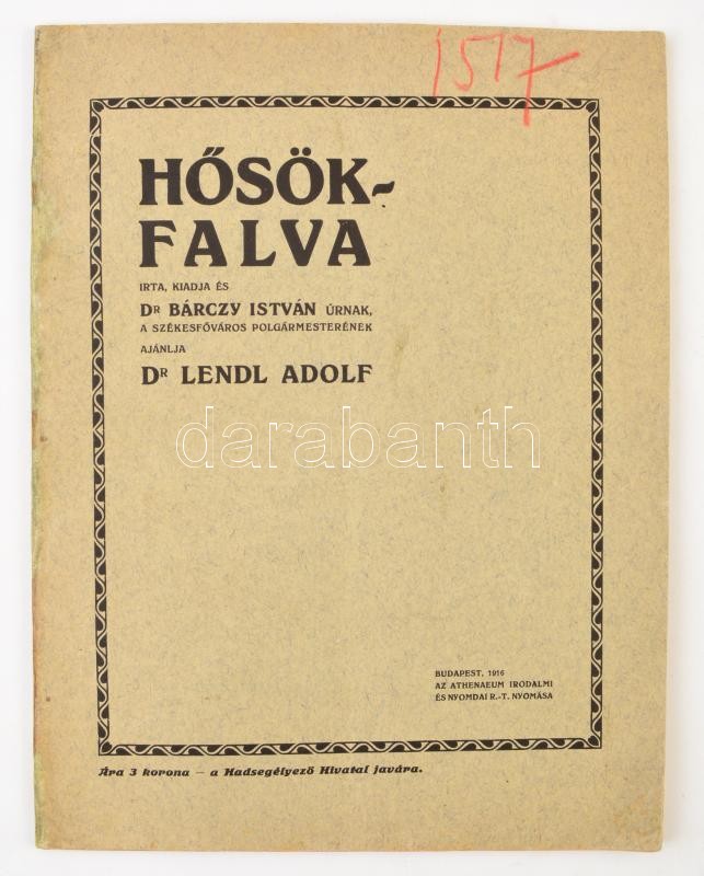 Lendl Adolf: Hősökfalva. Bp., 1916, Athenaeum. Papírkötésben, jó állap... https://www.darabanth.com/en/32-Major-auction/32.1/Books/Books-Military~13379/Lendl-Adolf-Hosokfalva-Bp-1916-Athenaeum-Papirkotesben-jo-allapotban-plus-Az-aradi-polgC3~II2044935