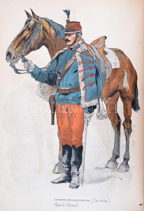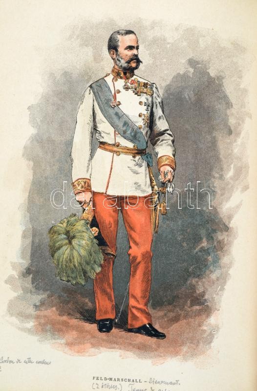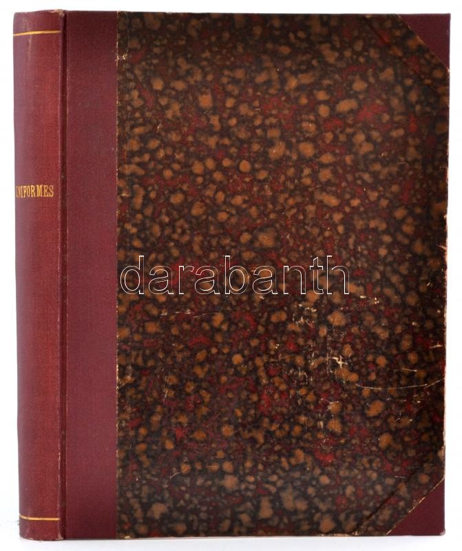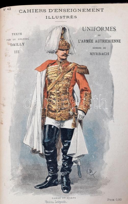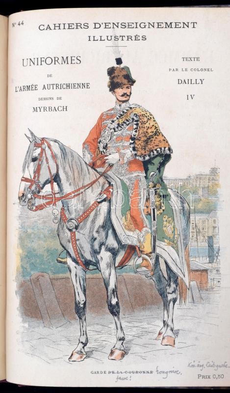 cca 1884-1886 Cahiers D'Enseignement Illustrés 16 száma. (Egybekötve.): N. 1-2. Uniformes de L'Armée Francaise En 1884. I-II. Armand Dumaresq rajzaival. M. De Bouille szövegével. N. 13-16. Uniformes de L'Armée Allemande En 1886. I-IV. Marius Roy rajzaival. A. Dally szövegével. N. 22. Uniformes de L'Armée Anglaise IV. Marius Roy rajzaival. A. Dally szövegével. N. 30. Les Grandes Manoeuvres de Cavalerie. I. Eugéne Chaperon rajzaival. Romuald Brunet szövegével. N. 32-33. Les Cuirassiers. (1672-1886.) Esquisses Anecdotiques I-II. Dick de Lonlay rajzaival és szövegével. N. 42-44. Uniformes de L'Armée Autrichienne. II-IV. Felician Myrbach rajzaival. A. Dally szövegével. N, 45-46.,48. Uniformes de L'Armée Italienne. I-II., IV. Marius Roy rajzaival. A. Dally szövegével. Paris, Ludovic Baschet,(Gillot-ny.), 31+1+61+1+49-63+1+15+1+39+1+17-63+1+31+1+49-63+1 p. Francia nyelven. Szövegközti és egészoldalas fekete-fehér illusztrációkkal. Egészoldalas színes litográfiákkal az európai hadseregek uniformisairól, Franciaország, Németország, Olaszország..stb., közte az Osztrák-Magyar Monarchia hadseregének uniformisaival is. Átkötött aranyozott gerincű modern félvászon-kötésben, a gerincen "Uniformes" felirattal, egy-két ceruzás jegyzettel, jó állapotban./ Cca 1884-1886 16 numberes of Cahiers D'Enseignement Illustrés. (In one book.) In French language. With many illustrations. Half-linen-binding.