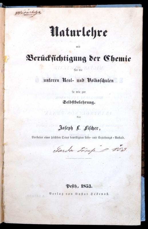 Joseph L. Fischer: Naturlehre, mit Berücksichtigung der Chemie für die unteren Real- und Voksschulen, sowie zur Selbstbelehrung. Pest, 1853, Gustav Heckenast, 255+1+8 p. Magyar és német nyelven. Első kiadás. Átkötött félvászon-kötésben, foltos lapokkal, kissé kopott borítóval./ Half-linen-bindin, with spotty pages, and little bit worn cover.