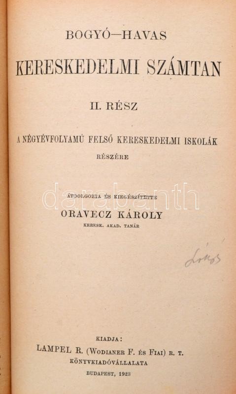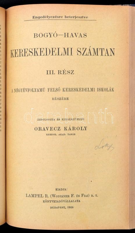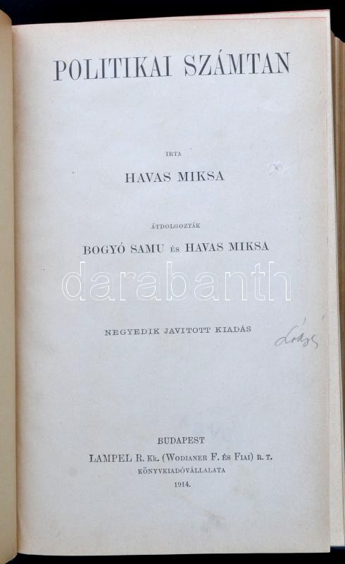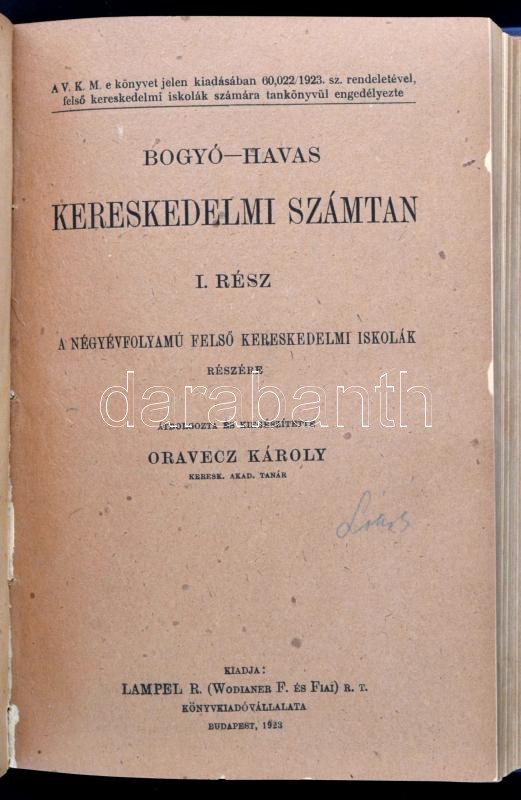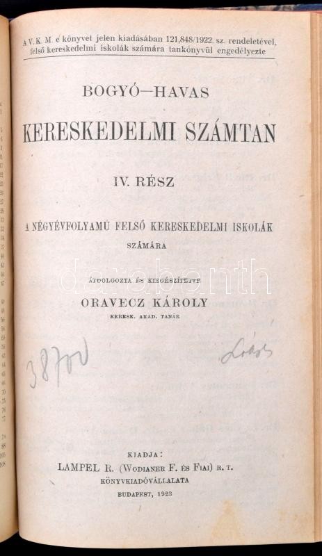 Kolligátum matematikai művekből: Havas Miksa: Politikai számtan. Átdolgozták: Bogyó Samu és Havas Miksa. Bp.,1914, Lampel R. (Wodianer F. és Fiai), 156+III p. Negyedik, javított kiadás.; Bogyó Samu-Havas Miksa: Kereskedelmi számtan I-IV. rész. Négy évfolyamú felső kereskedelmi iskolák részére. Átdolgozta: Oravecz Károly. Bp.,1923-1924, Lampel R. (Wodianer F. és Fiai), 205+168+111+1+160 p.; Dr. Juckel Gyula: Kereskedelmi számtan női kereskedelmi szaktanfolyamok valamint kereskedőtanonc-iskolák számára. Bp.,1914,Singer és Wolfner, 143 p.Negyedik kiadás. (Egybekötve.) Átkötött félvászon-kötés, kissé kopott borítóval, az első részben egykorú ceruzás jegyzettel, egyébként jó állapotban.
