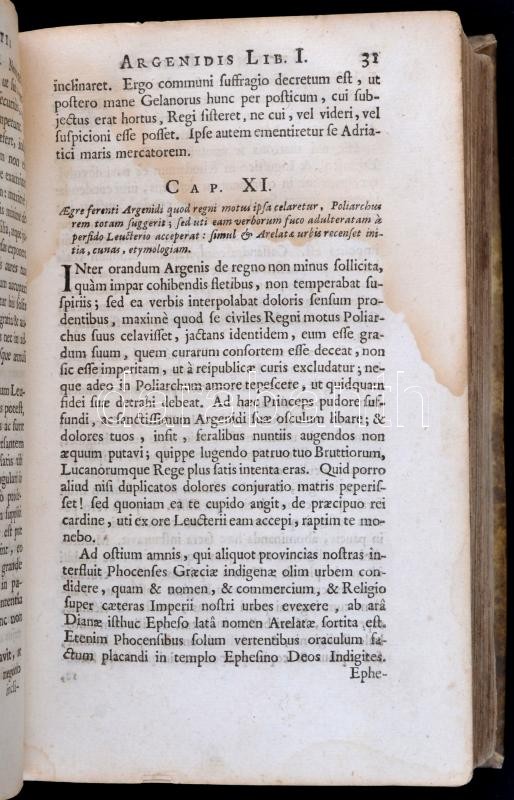 Description: Bugnotius, Ludov. Gabriel: Archombrotus et theopompus sive argenidis secunda & tertia pars, Leiden, 1669. Hackins 1669, 6+ (14 ) + 624 + ( 15 ) p. Korabeli pergamenkötésben Egy két lap vízfoltos / some pages are wet stained
