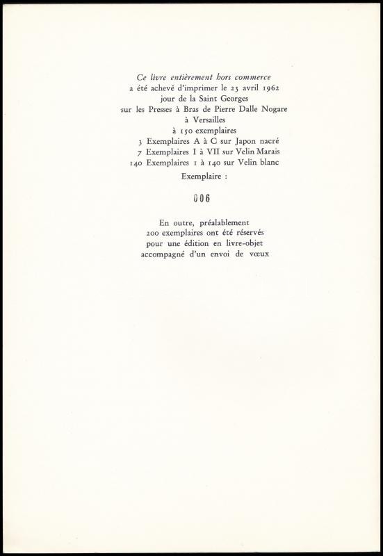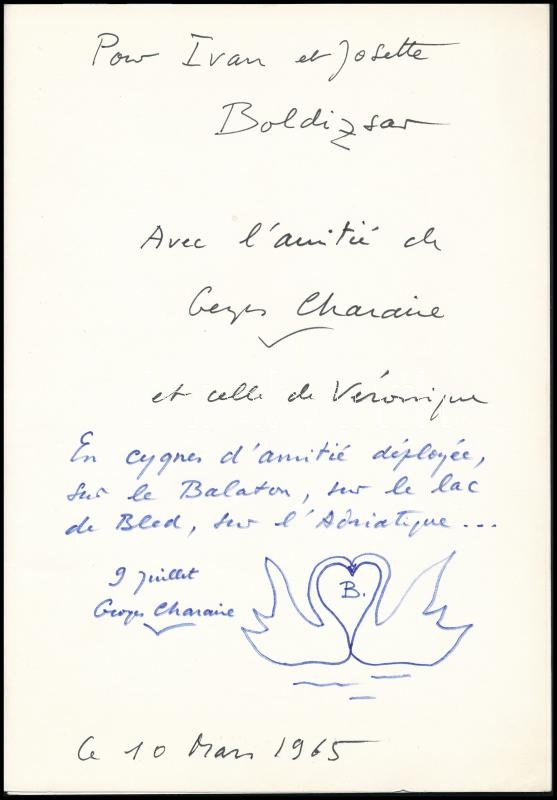 Charaire, Georges: Signes. Versailles, 1962. PapÃrkötés, egész oldalas fametszettel illusztrálva, készült 150 példányban, 6. számozott példány, a szerzÅ‘ által Boldizsár Iván és felesége számára dedikált példány! Hozzá tartozik: Georges Charaire és felesége, Véronique francia nyelvű, nyomtatott újévi jókÃvánsága, általuk tintával aláÃrva; Boldizsár Ivánról és feleségérÅ‘l készült fénykép, 14×9 cm/ Paperbinding. Published in 150 copies. 6th numbered copy. Signed by the author.