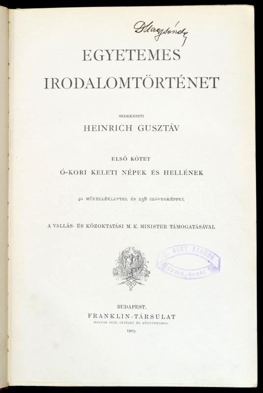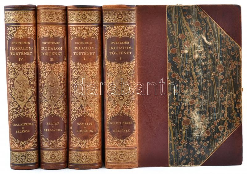 Egyetemes Irodalomtörténet. I-IV. kötet. I. kötet: Ó-kori keleti népek és hellének. II. kötet: Rómaiak és románok. III. kötet: Kelták és germánok. IV. kötet: Ural-altajiak és szlávok.Szerk.: Heinrich Gusztáv. Bp.,1903-1911, Franklin, XX+742 p.+40 t.;XV+915 p.+31 t.;XII+680 p.+35 t.;XI+746+1 p.+25 t.+1 kihajtható térkép. Kiadói dúsan aranyozott félbőr-kötésben, márványozott lapélekkel, a borítón kis kopásnyomokkal, az I. kötetből egy lap kijár, IV. kötet hátán apró sérüléssel, egy-két lapszéli folttal.