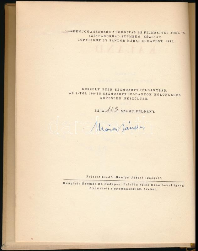 Márai Sándor: Kaland. Színmű három felvonásban. Hincz Gyula rajzaival. Bp.,1940,Singer és Wolfner Irodalmi Intézet Rt.,(Hungária Nyomda Rt.), 122+1 p. Kiadói egészvászon-kötés, kissé foltos borítóval, a címlapon kis sérüléssel. Dr. Ürögdi György (1904-1987) történész magánkönyvtári bélyegzőivel a címlapon. Számozott (125./1000) és a szerző által aláírt, valamint dedikált példány./ Linen-bindin,with little bit spotty cover, with little damage on the title page. Signed by the author, numbered (125./1000) copy and autograph signature of the author. In Hungarian language.