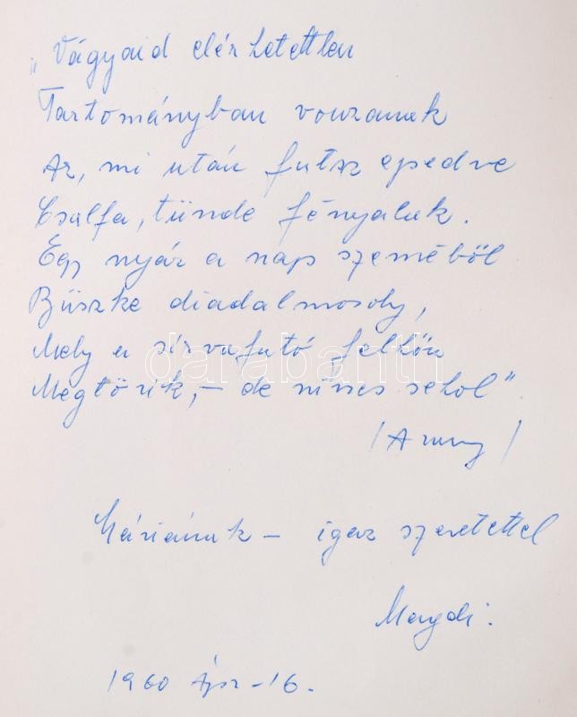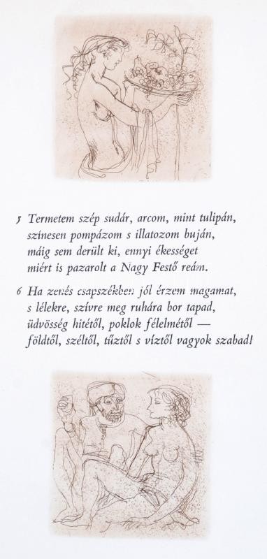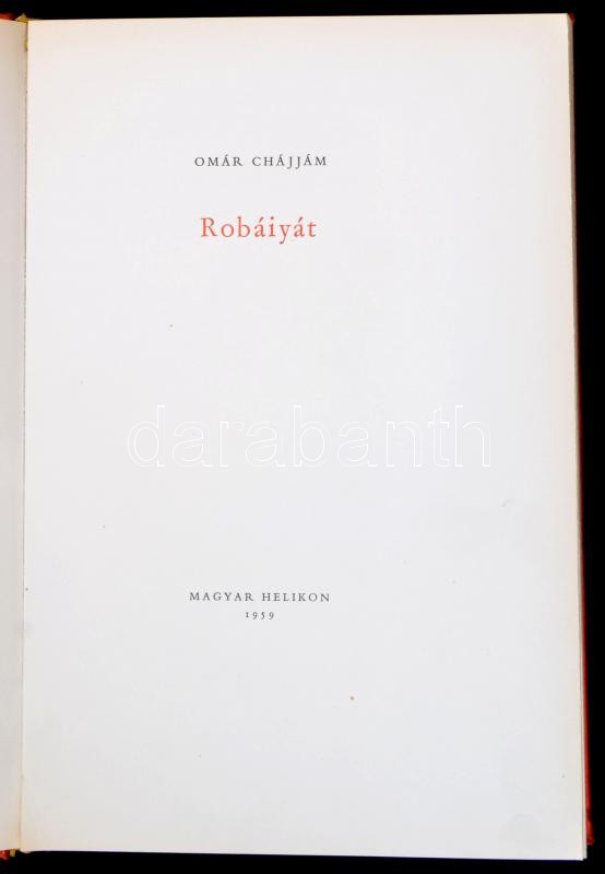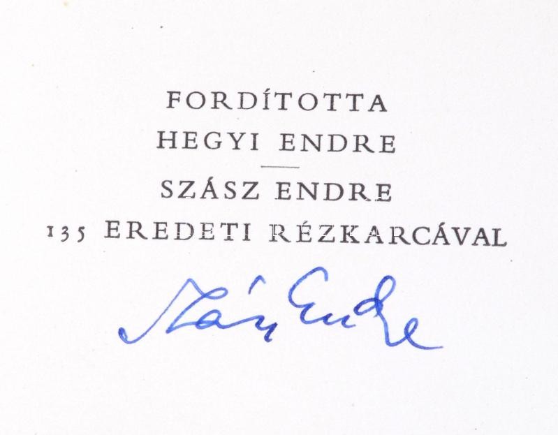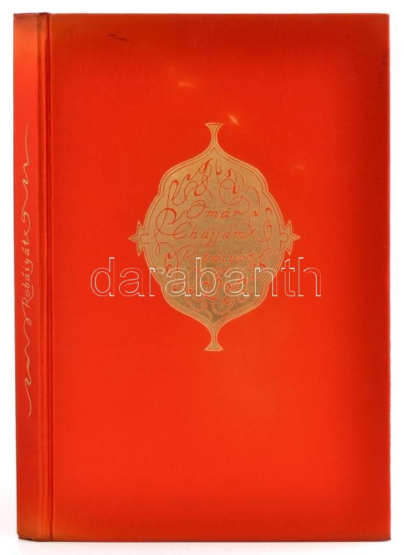 Omár Chájjám: Robáiyát. Fordította Hegyi Endre. Bp., 1959, Magyar Helikon. Szász Endre 135 eredeti rézkarcával. Számozott (2000/135.), és a művész, Szász Endre (1926-2003) által aláírt példány. Kiadói selyemkötésben, ajándékozási bejegyzéssel, a címlap kijár, de ezt leszámítva szép állapotban. / With the copper engravings of Endre Szász. Signed by the artist.