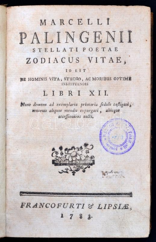 Description: Palingenii, Marcelli: Marcelli Palingenii Stellati Zodiacus Vitae id est De hominis Vita, Studio, ac moribus optime instituendis. Libri XII. Ad potimarum Editionum Fidem Accurate. Ed. C.H. Weise. Francofurti, 1783. 465p. Korabeli bordázott egészbőr kötésben / In full leather binding.
