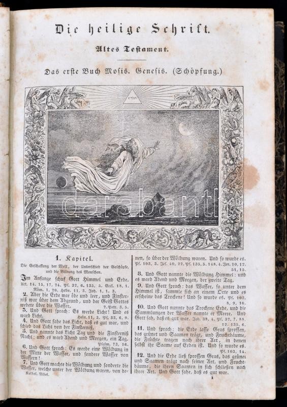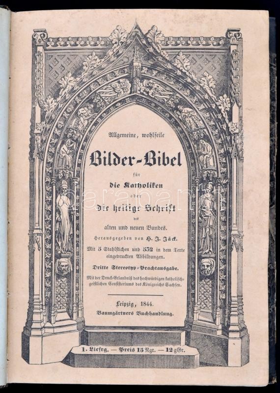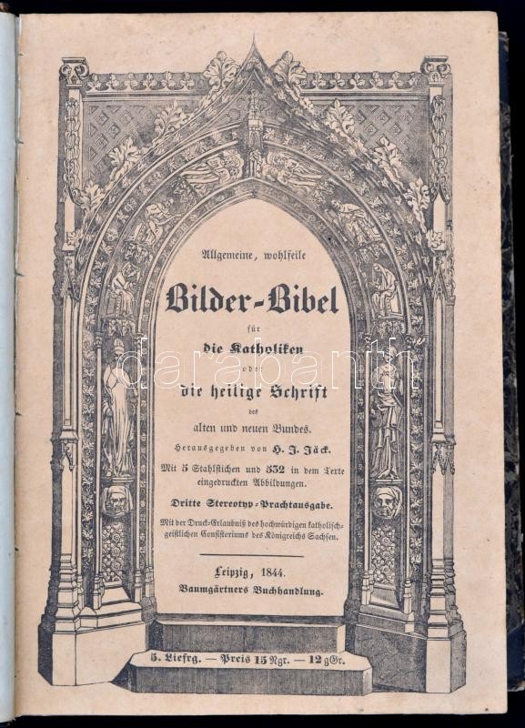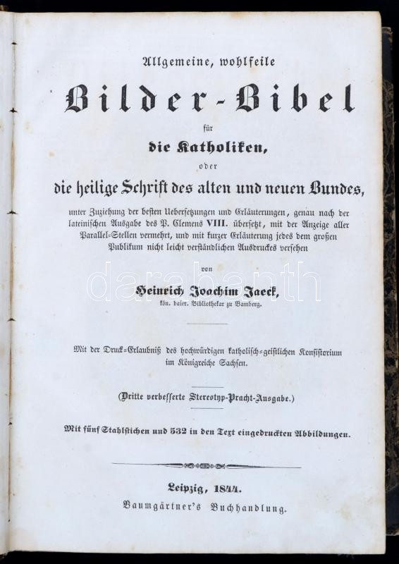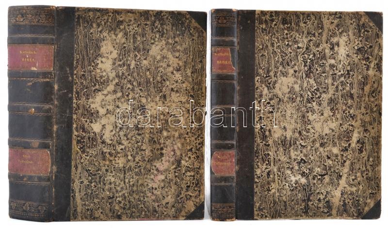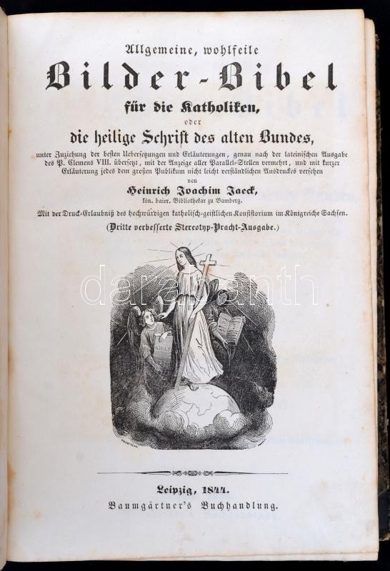 Description: Jaeck, Heinrich Joachim; Allgemeine, wohlfeile Bilder Bibel für die Katholiken oder die heilige Schrift des alten Bundes I.-II.. Leipzig, 1844. Baumgärtner, - Német képes Biblia. Korabeli félbőr kötésben, jó állapotban / Half-leather-binding, in German language.