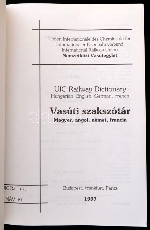 Vasúti szakszótár. Magyar, angol, német francia. - UIC Railway dictionary. Bp., 1997. MÁV. 862p.. Kiadói műbőr kötés