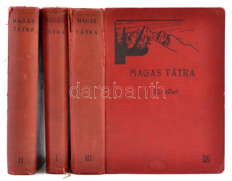 A Magas Tátra részletes kalauza. Szerk.: Hefty Gy. Andor, Vigyázó János, Mervay Sándor. I.-III. kötet. I. kötet. Szerk.: Vigyázó János, Szerk.: Hefty Gy. Andor. II. kötet. Szerk.: Vigyázó János, Mervay Sándor. III. kötet: Hegymászókalauz. Szerk.: Dr. Komarnicki Gyula, Dr. Serényi JenÅ‘. I. köt: Kriván-Csurbina-Lengyelnyereg. II. kötet: Kis-Viszoka-Kopahágó. III. kötet: Hátsó Barátcsorba-Liliowe. Függelék: Téli hegymászások. Bp., 1914, Turistaság és Alpinizmus,(Pécs, Wesely és Horváth-ny.), 9 sztl. lev.(Korabeli reklámok, vasúti menetrend)+VIII+399+1 p.+9 sztl. lev. (Korabeli reklámok.)+ 1 t.(térkép-melléklet.);9 sztl. lev.(Korabeli reklámok, vasúti menetrend)+VIII+431+1 p.+9 sztl. lev.+10 t.(Kihajtható térképmelléklet.);+9 sztl. lev.+XXXII p. +7 sztl. lev.+2+1-224;225-436,437-520+2 p. Fekete-fehér ábrákkal, táblázatokkal, kihajtható térképekkel, korabeli hirdetésekkel gazdagon illusztrált. Kiadói egészvászonkötésben, és kiadói védÅ‘tokban, Grolig József-kötés, kissé kopott borÃtóval, az I. kötetbÅ‘l a térkép kiszakadt, szakadozott sarkán kis hiány, a II. kötetbÅ‘l egy kihajtható térkép hiányzik, a III. kötetben a védÅ‘tok elejébÅ‘l a tartalomjegyzék rész kiszakadt, de a védÅ‘tokban meg van. /The detailed guide of the High Tatra. I-III. volumes. Edited by Andor Gy. Hefty, János Vigyázó, Sándor Mervay, Gyula Komarniczki Gyula, JenÅ‘ Serényi. Bp.,1914, Tourism and Alpinism. Linen-binding, with little bit worn cover, the map in the I. volume damaged and coming out, one map is missin from the II. volume, the table of content is coming out from the III. volume. In Hungarian language.