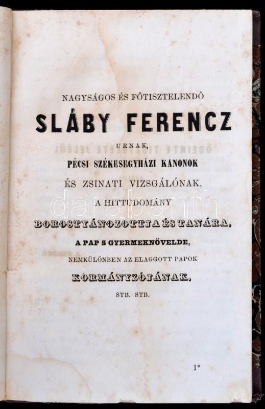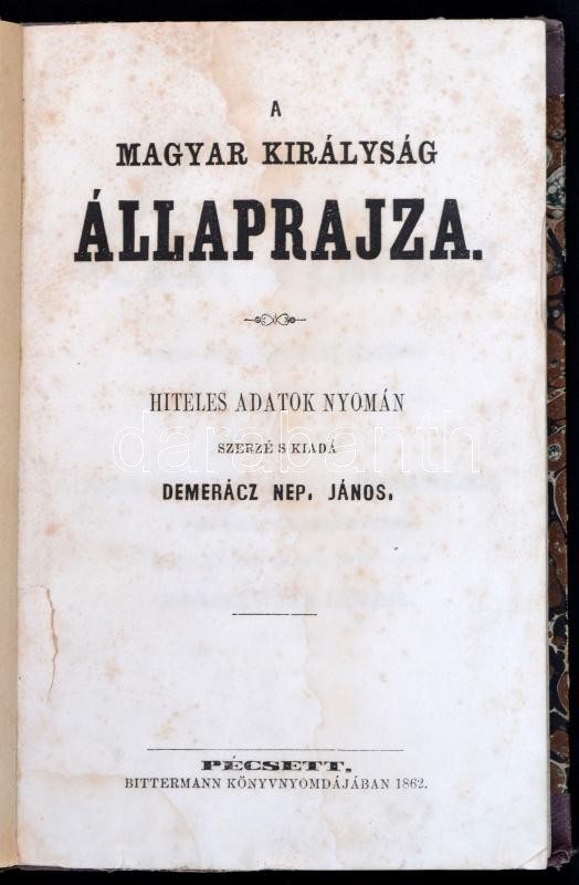 Demerácz Nep(omuk) János: A magyar királyság állaprajza. Pécs, 1862, Bittermann-ny., 248 p. Későbbi átkötött félvászon-kötésben, kissé kopott borítóval, kis szakadással a címlapon, foltos lapokkal./Half-linen-binding, with little bit damaged title page, with little bit worn cover.
