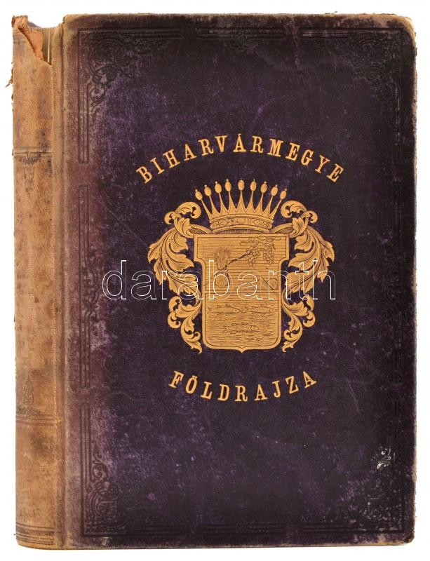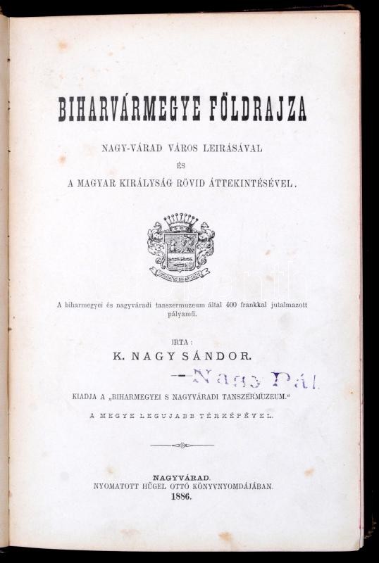 K. Nagy Sándor: Biharvármegye földrajza. Nagyvárad város leírásával és Magyar Királyság rövid áttekintésével. Kiadja a "biharmegyei és nagyváradi tanszermúzeum." Nagyvárad, 1886, Hügel Ottó, 10+229+5 p. Kiadói aranyozott egészbőr-kötés, kopott borítóval, kopott és sérült gerinccel. A címlapon jelzett térkép nem jelent meg./Sándor K. Nagy: Geography of Bihar/Bihor County. With description of Nagyvárad/Oradea/Großwardein and a short overview of the Hungarian Kingdom. Nagyvárad/Oradea/Großwardein, 1886, Otto Hügel. Gilt leather-binding, with worn cover and damaged spine. The map didn't came out. In Hungarian language.