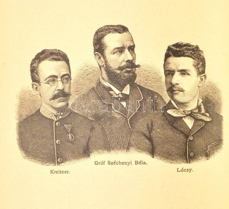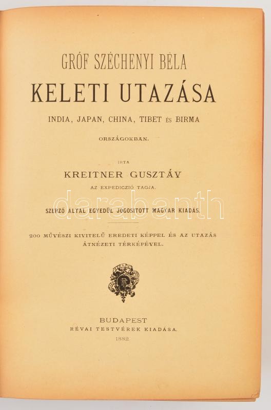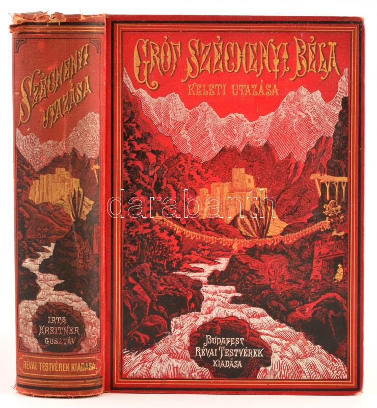 Kreitner Gusztáv: Gróf Széchényi Béla keleti utazása India, Japan, China, Tibet, és Birma országokban. Bp.,1882, Révai, XVI+1028 p. Számos szövegközti és egészoldalas fekete-fehér illusztrációval. Kiadói aranyozott, festett, illusztrált egészvászon-kötés,(Scheibe Ármin-kötés, Bécs,) festett lapélekkel, enyhén sérült gerinccel./Gilt, and painted linen-binding, with little bit damaged spine, with illustrations, in Hungarian language.
