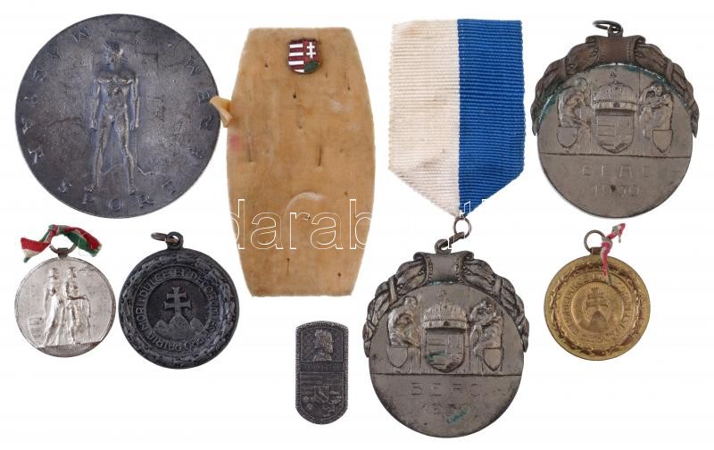~1930-1940. Götz Gusztáv (1900-1970) evezős Európa-bajnok hagyaték tételek, benne: 6db sportérem, több szalaggal, némelyikük jelzett (Sződy, Arató), 6db régi textil címerekkel, jelvények T:vegyes / Hungary ~1930-1940. Legacy of Gusztáv Götz (1900-1970) European Champion of rowing, including: 6pcs of sport medallions, most of them with ribbon, some of them marked (Sződy,Arató), 6 pcs of old textiles with crests, badges C:mixed