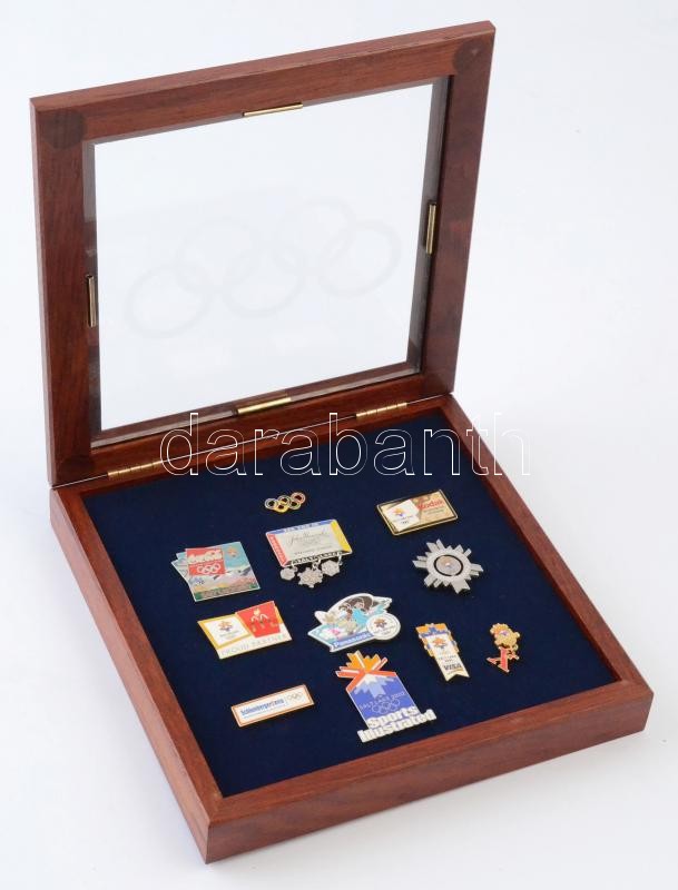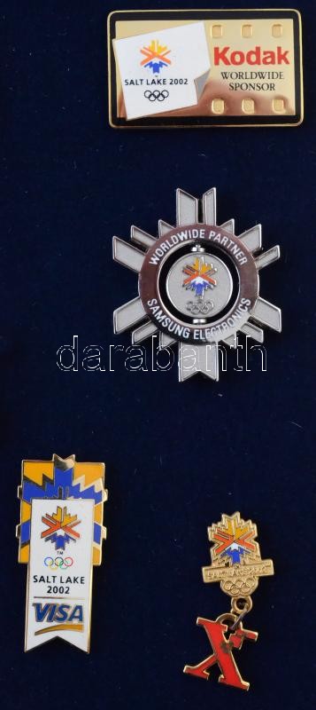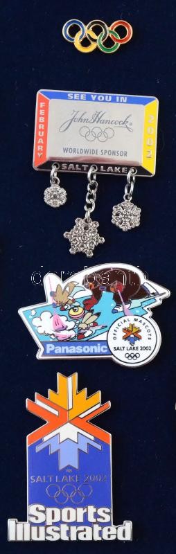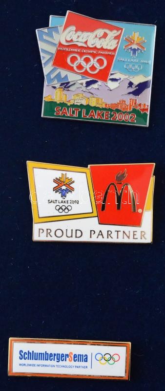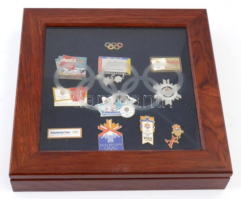 Amerikai Egyesült Államok 2002. 11db klf olimpiai támogató jelvény a Salt Lake City-ben rendezett Téli Olimpiára, közte "Coca-Cola", "Kodak", "Panasonic", a jelvények fából készült tokban T:1 / USA 2002. 11pcs of diff Olympic sponsor badges for the Salt Lake City Winter Olympics, including "Coca-Cola", "Kodak", "Panasonic", all the badges in a wooden case C:UNC