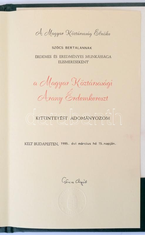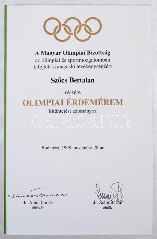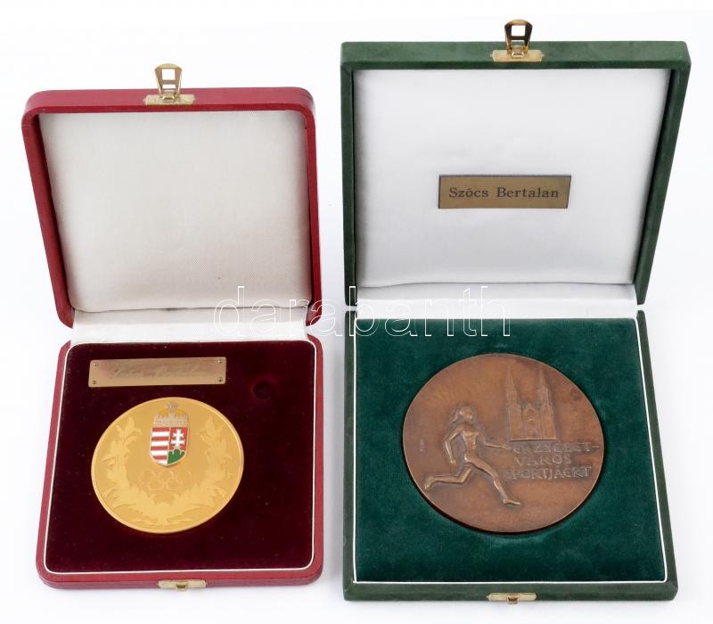 Sportolói hagyaték tétel, benne Papp László (1947-) 1992. "Magyar Olimpiai Érdemérem" aranyozott, zománcozott Br érem dísztokban (70mm), mellette adományozói okirat; "Erzsébetváros Sportjáért" Br emlékérem dísztokban (93mm); "Magyar Köztársasági Arany Érdemkereszt" adományozói okirata T:2 / Legacy of a Hungarian sportsman, including 1992. "Hungarian Olympic Merit Medal" gold plated and enamelled Br medal in original case. Sign.: László Papp (70mm), with awarding document; "For Sports in Elizabethtown" Br commemorative medal in original case (93mm); "Golden Cross of Merit of the Hungarian Republic, Civil Grade" awarding document of the decoration C:XF