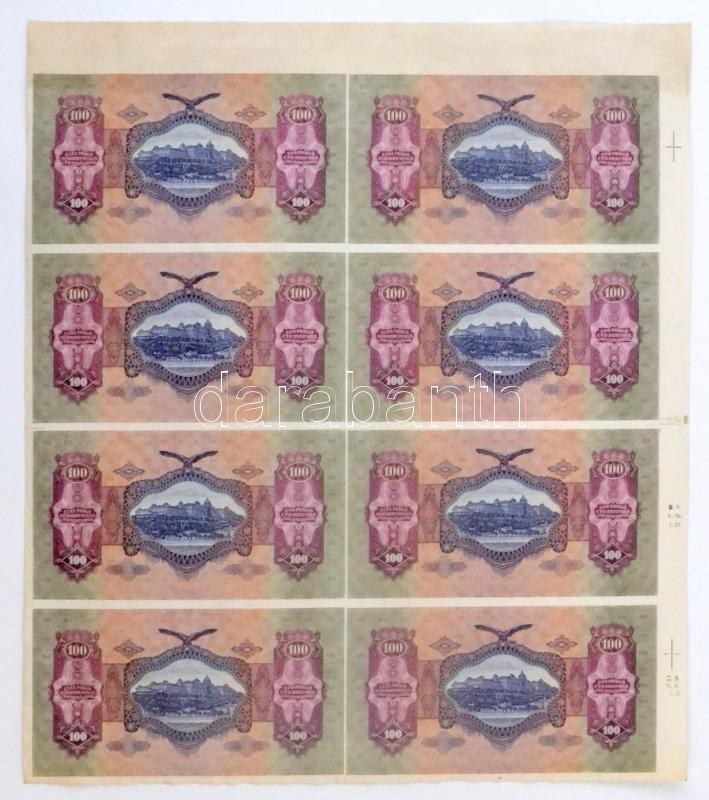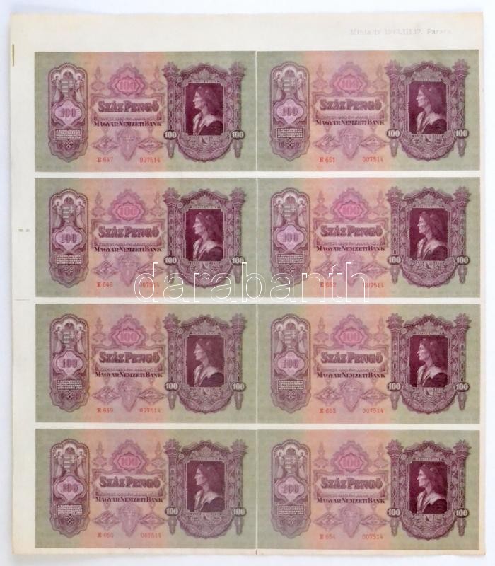 1930. 100P 8db-os vágatlan minta ívben, "1943. III. 17." dát... https://www.darabanth.com/en/32-Major-auction/32.1/Numismatics/Hungarian-and-foreign-banknotes~13434/1930-100P-8db-os-vagatlan-minta-ivben-1943-III-17-datummal-illesztokerettel-TI-RR--~II2032977