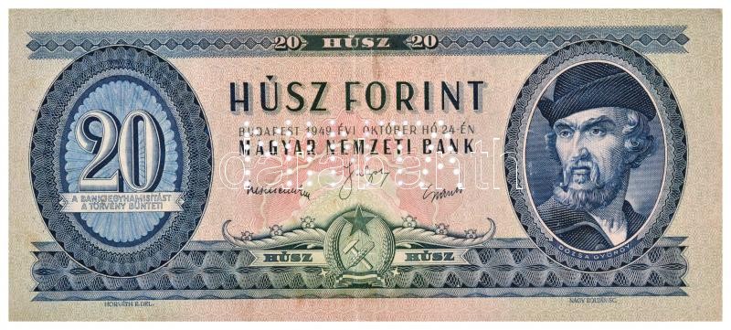 Description: 1949. 20Ft "C106 039779" sorozat és sorszámmal, "MINTA" perforációval T:III / Hungary 1949. 20 Forint with "C106 039779" serial number and with "MINTA" (SPECIMEN) perforation C:F