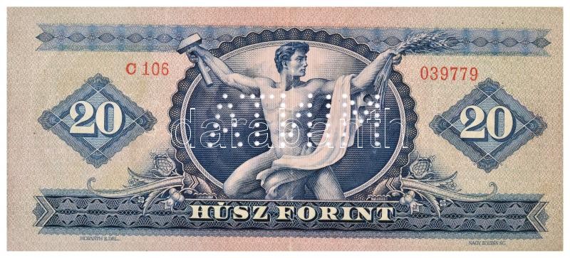 1949. 20Ft "C106 039779" sorozat és sorszámmal, "MINTA&... https://www.darabanth.com/en/32-Major-auction/32.1/Numismatics/Hungarian-and-foreign-banknotes~13434/1949-20Ft-C106-039779-sorozat-es-sorszammal-MINTA-perforacioval-TIII-Hungary-1949-20-F~II2009129
