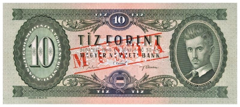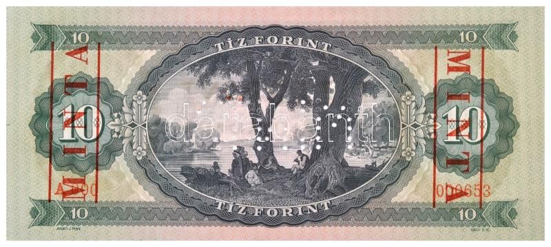 Description: 1969. 10Ft "A000 000653" sorozat és sorszámmal, piros "MINTA" felülnyomással és perforációval T:I / Hungary 1969. 10 Forint with "A000 00653" serial number and with red "MINTA" (SPECIMEN) overprint and perforation C:UNC