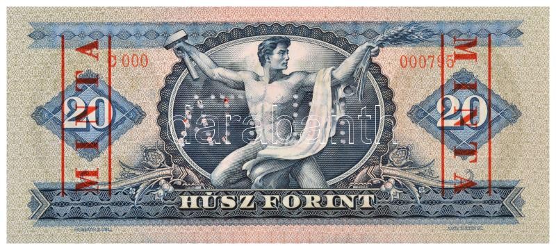 Description: 1969. 20Ft "C000 - 000795" sorozat és sorszámmal, piros "MINTA" felülnyomással és perforációval T:I,I- / Hungary 1969. 20 Forint with "C000 - 000795" serial number and with red "MINTA" (SPECIMEN) overprint and perforation C:UNC,AU