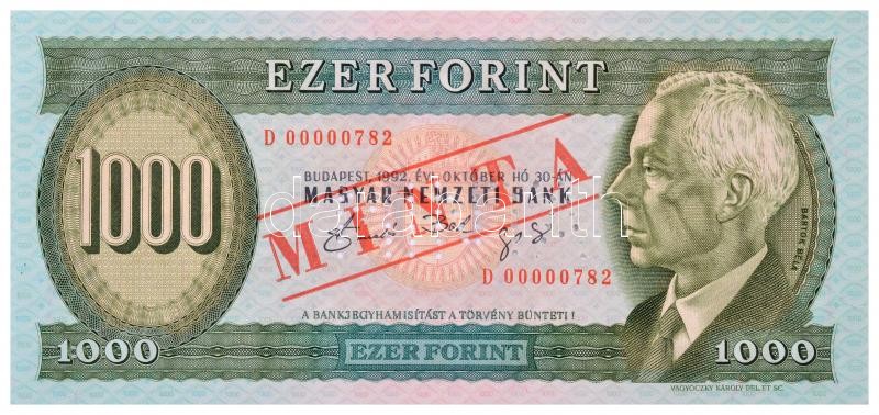 1992. 1000Ft "MINTA" perforációval és felülnyomással "D 00000782" sorszámmal T:I / Hungary 1992. 1000 Forint with "MINTA (SPECIMEN)" overprint and perforation, "D 00000782" serial number C:UNC