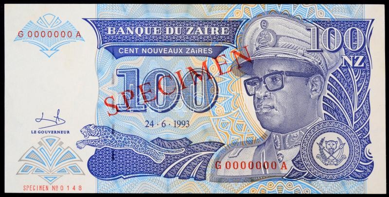 https://www.darabanth.com/en/32-Major-auction/32.1/Numismatics/Hungarian-and-foreign-banknotes~13434/Zaire-1993-100Z-MINTA-felulbelyegzessel-G0000000A-TI-I--Zaire-1993-100-Zaires-with-SP~II2046443