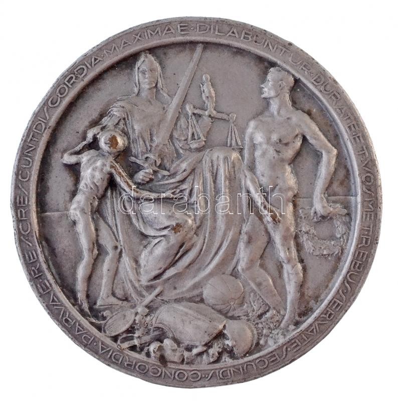 1912. "BUDAPEST SZÉKESFŐVÁROSI KÖZLEKEDÉSI RÉSZVÉNYTÁRSASÁG SPORTEGYESÜLETE A SPORT TERÉN ELÉRT KIVÁLÓ ÉRDEMEK JUTALMAZÁSÁRA / CONCORDIA PARVAERES CRESCUNTDISCORDIA MAXIMAE DILABUNTUR DURATEET VOSMET REBUS SERVATES ECUNDIS" ezüstözött Br emlékérem, peremén "BRONZ" jelzéssel (32,30g/41mm) T:2 több ph. / Hungary 1912. "BUDAPEST SZÉKESFŐVÁROSI KÖZLEKEDÉSI RÉSZVÉNYTÁRSASÁG SPORTEGYESÜLETE A SPORT TERÉN ELÉRT KIVÁLÓ ÉRDEMEK JUTALMAZÁSÁRA / CONCORDIA PARVAERES CRESCUNTDISCORDIA MAXIMAE DILABUNTUR DURATEET VOSMET REBUS SERVATES ECUNDIS" silver plated Br commemorative medallion, with "BRONZ" hallmark on the edge (32,30g/41mm) C:XF multiple edge errors