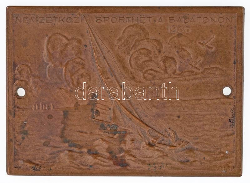 Gács Lajos (1905-1981) 1936. "Nemzetközi Sporthét a Balatonon 1936" egyoldalas Br plakett, két oldalán fúrt lyukkal "BOCZÁN GY" gyártói jelzéssel (50x69mm/72,48g) T:2 / Hungary 1936. "Nemzetközi Sporthét a Balatonon (International Sports Week on Balaton) 1936" one-sided cast Br plaque, with drilled holes on the sides with "BOCZÁN GY" maker's mark (50x69mm/72,48g) C:XF