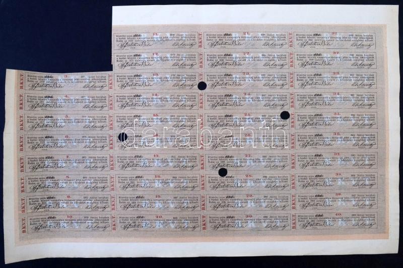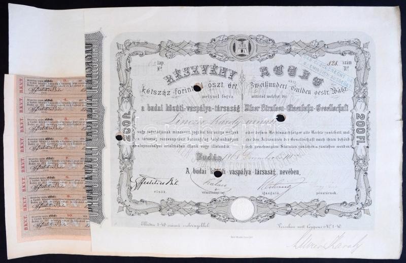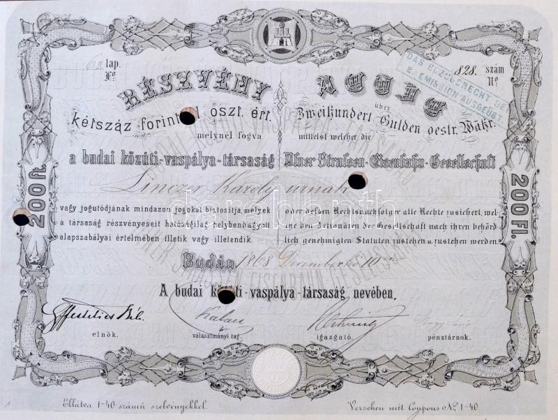 Buda 1868. "Budai Közúti-vaspálya Társaság" részvénye 200Ft-ról, szelvényekkel, bélyegzéssel, szárazpecséttel, lyukasztással érvénytelenítve T:III szélén kis szakadás / Hungary / Buda 1868. "Budai Közúti-vaspálya Társaság" share about 200 Forint with coupons, overprint and embossed stamp, cancelled with holse C:F small tears at edge