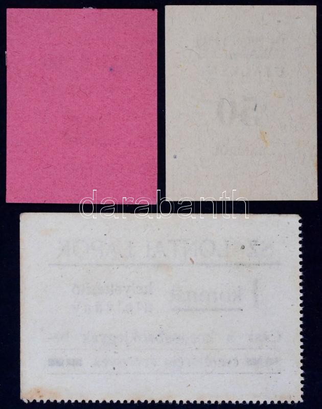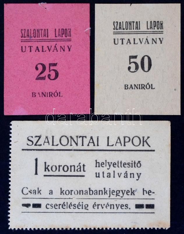 Nagyszalonta ~1920. 10 bani "Szalontai Lapok" utalvány + 25 bani "Szalontai Lapok" utalvány + 1K "Szalontai Lapok" utalvány, perforált ív darab T:I- kis ragasztónyom, fo. / Romania / Salonta ~1920. 10 Bani "Szalontai Lapok" voucher + 25 Bani "Szalontai Lapok" voucher + 1 Korona "Szalontai Lapok" voucher, perforated sheet piece C:AU small gluemark, spotted