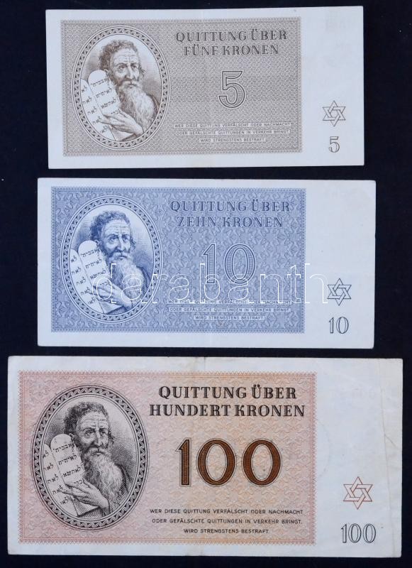 German Third Reich / Protectorate of Bohemia and Moravia / Theresienstadt ghetto 1943. January 1. 5 Kronen + 10 Kronen + 100 Kronen with low serial number "000167" C:F