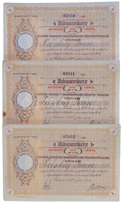 Románia / Satu-Mare (Szatmár) 1922. "Szatmár Vármegyei Takarépénztár Részvénytársaság" névre szóló részvénye 600L-ről (3x) sorszámkövetők, szelvényekkel, szárazpecséttel T:II,II- / Romania / Satu-Mare (Szatmár) 1922. "Szatmár Vármegyei Takarépénztár Részvénytársaság" share with the shareholders name, about 600 Lei (3x), sequential serials, with coupons C:XF,VF
