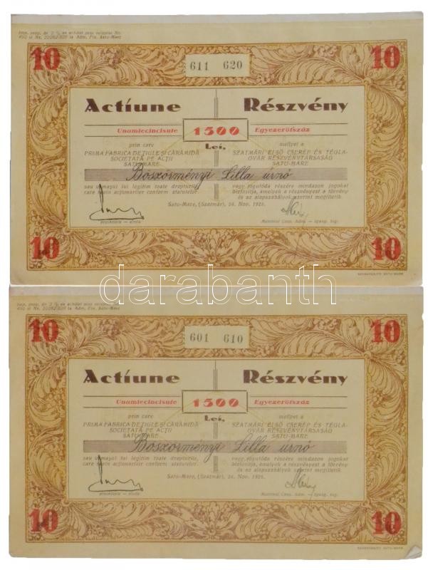 Románia / Satu-Mare (Szatmár) 1928. "Szatmári Első Cserép és Téglagyár Részvénytársaság" névre szóló 10db részvénye egyben, összesen 1500L-ről (2x) sorszámkövetők, szelvényekkel, szárazpecséttel T:II egyiken ly. / Romania / Satu-Mare (Szatmár) 1928. "Szatmári Első Cserép és Téglagyár Részvénytársaság" share with the shareholders name, ten shares in one in sum total of 1500 Lei (2x), sequential serials, with coupons C:XF one with hole