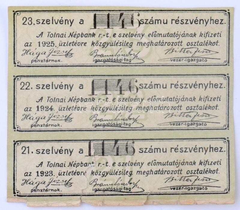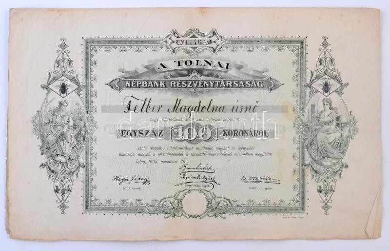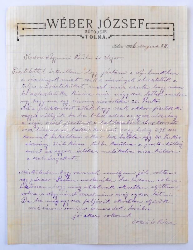 Tolna 1905. "A Tolnai Népbank Részvénytársaság" részvénye 100K-ról, szárazpecséttel, szelvényekkel + 1926. kézírásos levél a részvény értékveszéséről, "WÉBER JÓZSEF SÜTÖDÉJE TOLNA" fejléces papíron T:III / Hungary / Tolna 1905. "Bank of Tolna Joint Stock Company" share about 100 Korona, with coupons and embossed stamp + 1926. letter regarding the devaluation of the share on "WÉBER JÓZSEF SÜTÖDÉJE TOLNA" letterhead C:F