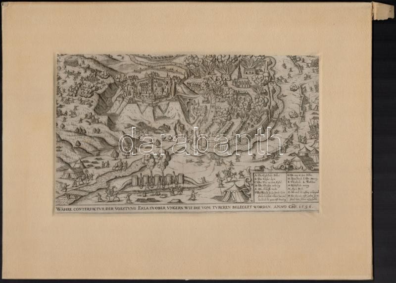 1596 Eger ostroma és a környék térképe. Hieronymus Ortelius "Chronologia oder historische Beschreibung" című munkájából, , 25,5x15,5 cm kartonon / 1596 Wahre conterfactur der Voestung Erla in Ober Ungern wie die vom Turcken belegert worden The Battle of Eger, copper plate engraving, from the "Chronologia oder historische Beschreibung" of Hieronymus Ortelius 25,5x15,5 cm On cartboard