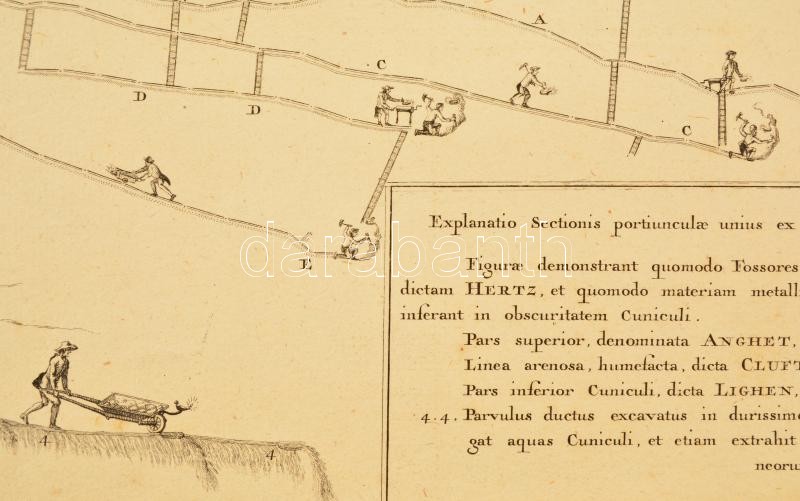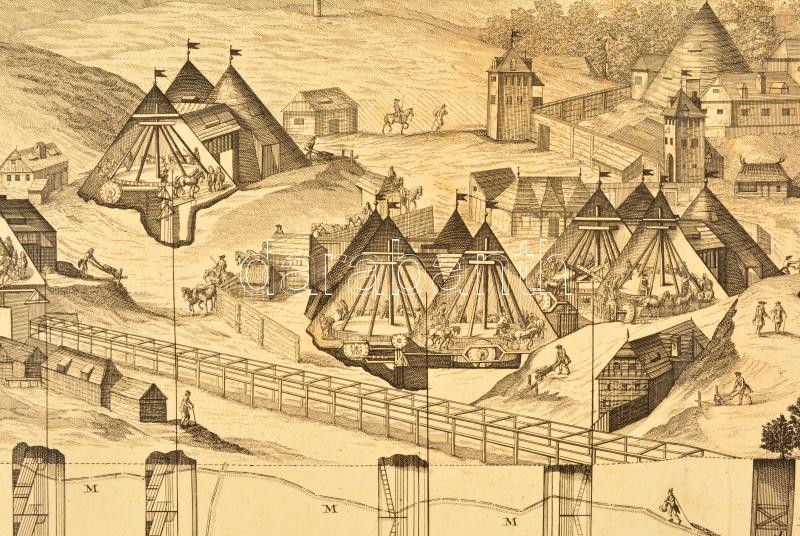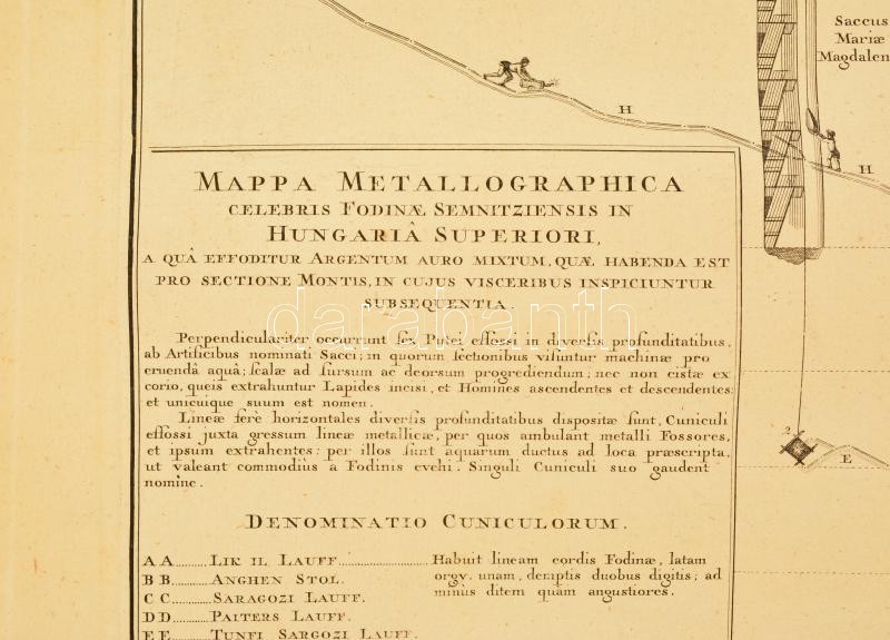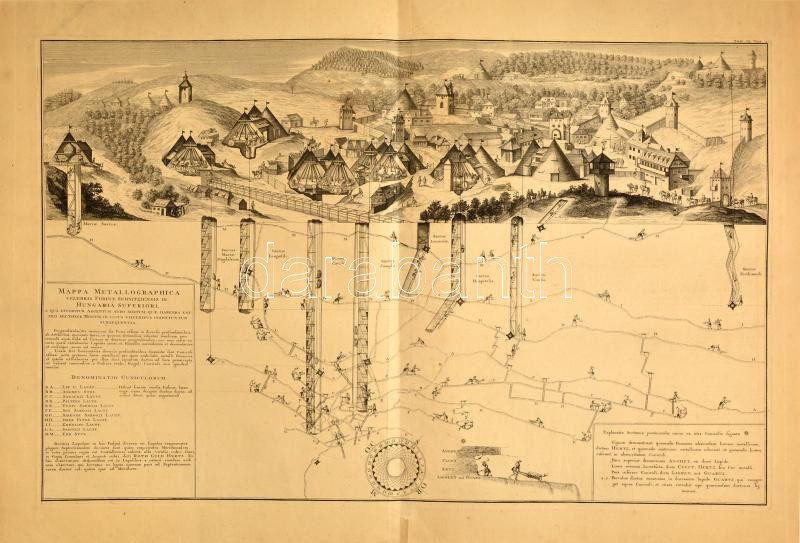 1726 Selmecbánya latképe és bányáinak, tárnáinak térképe Mappa metallographica celebris fodinae Semnitziensis in Hungaria superiori, a qua effoditur argentum auro mixtum, quae habenda est pro sectione montis, in cujus visceribus inspiciuntur subsequentia / Selmecbánya latképe és bányáinak, tárnáinak térképe. Marsigli, Luigi Ferdinando (1658-1730): Danubius Pannonico-mysicus : observationibus geographicis, astronomicis, hydrographicis, historicis, physicis, perlustratus et in sex tomos digestus.Haga, 1726 c. munkájából. III. kötet 10. tábla. Nagyméretű rézmetszet. 70,5x45 cm. / Mines and view of Schemnitz (Banska Slavnica. Copper plate engraving. Az olasz Luigi Ferdinando Marsigli a török elleni felszabadító harcok idején hadmérnökként szolgált a császári seregben, 1691-ben az angol Royal Society tagjává választották, és Magyarország földrajzának tanulmányozására, adatgyűjtésre kérték fel. Hazánk térképeinek pontosítását segédjével, Johann Christoph Müllerrel közösen végezte el: Szép, tiszta metszet.