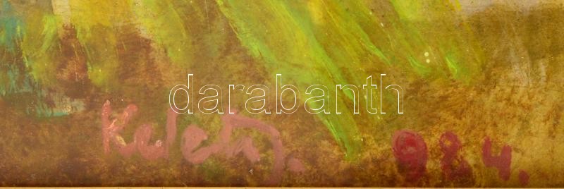 Keleti Jenő (1920-1998): Két ház őszi tájban. Olaj, farost, jelzett, üvegezett keretben, 60×70 cm