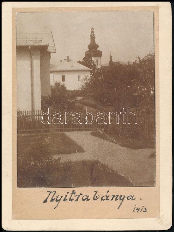 1913 Nyitrabánya (ma: Handlová), háttérben a katolikus templom, fotó, kartonra ragasztva, feliratozva, 9×7,5 cm / Handlová, Slovakia, Catholic church, photo on cardboard