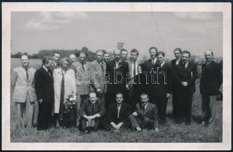 1948 Nikla, Csoportkép az 1948-as niklai ünnepségről, rajta középen: Berzsenyi Mária a költő unokája, mellette Németh László és Illyés Gyula, valamint Lakatos Miklós és Tolnai Gábor államtitkárok, továbbá a Berzsenyi Dániel Társaság vezetői (ülnek, Kanyar József, Vörös Béla, Takáts Gyula), fotólap, a hátoldalán feliratozva, 9x14 cm