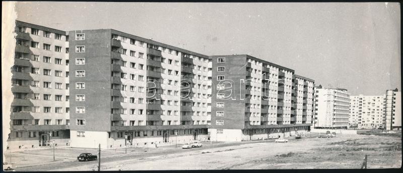 1967 Budapest, Új lakóházsor az Árpád hídnál, feliratozott sajtófotó, sérüléssel, 12×29 cm