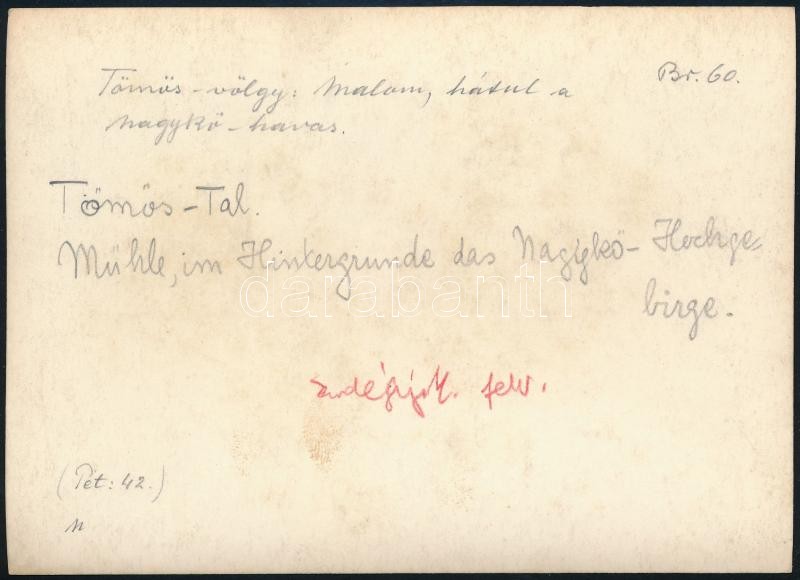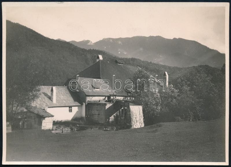 cca 1910 Malom a Tömös-völgyben, háttérben a Nagykőhavas, Erdélyi Mór felvétele, hátulján feliratozva, 11,5×16 cm / cca 1910 Mill in the Timiş valley, with the Masivul Piatra Mare in the background, photograph taken by Mór Erdélyi, with notes on its back, 11,5×16 cm