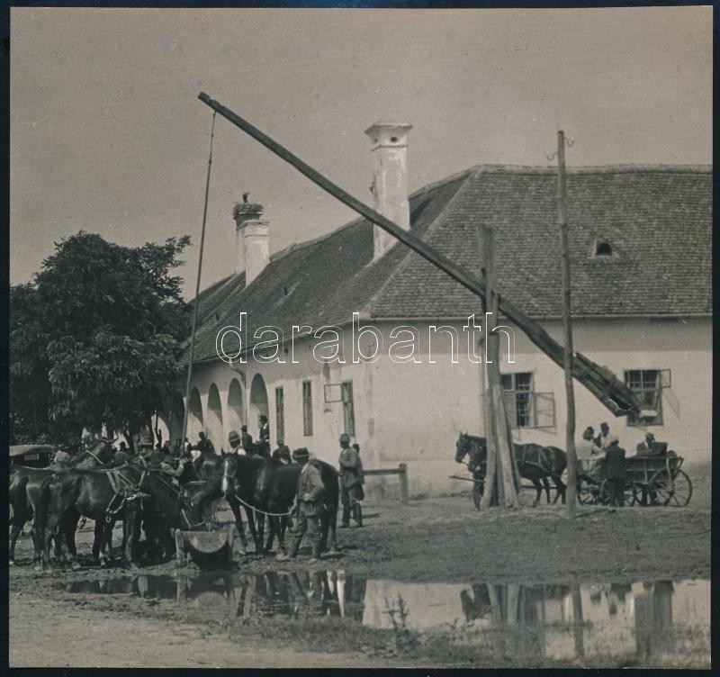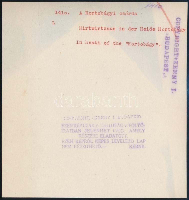 cca 1930-1940 Kerny István (1879-1963): Sokadalom a hortobágyi csárda körül, feliratozott, pecséttel jelzett vintage fotóművészeti alkotás, 16x16,5 cm / cca 1930-1940 István Kerny (1879-1963): Hortobágy, Hungary, description on the verso, with artist's stamp, 16x16,5 cm