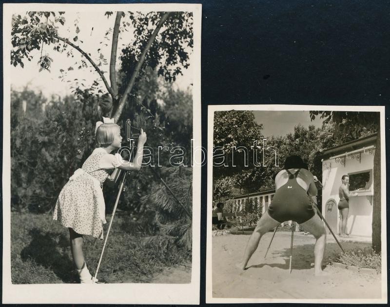 Description: cca 1936 Ötlábú fényképészek, 2 db jelzés nélküli vintage fotó Thöresz Dezső (1902-1963) békéscsabai gyógyszerész és fotóművész hagyatékából, 6x5,3 cm és 8,5x6 cm
