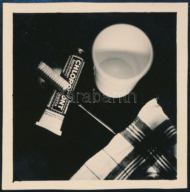 Description: cca 1938 Thöresz Dezső (1902-1963) békéscsabai gyógyszerész és fotóművész hagyatékából, jelzés nélküli vintage fotó (Fogmosás előtti csendélet), 6x6 cm