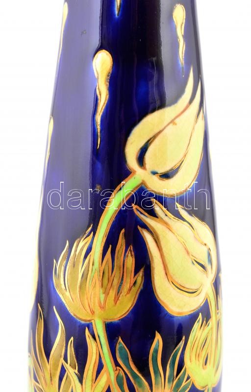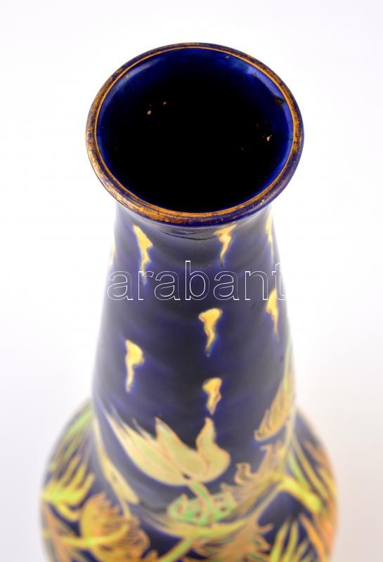 Description: cca 1905 Zsolnay tulipános szecessziós váza, fehércserép, magas tüzű színes mázakkal, jelzett (körpecsét), formaterv: Apáti Abt Sándor, formaszám:7101, kopott aranyozással, m: 35,8 cm