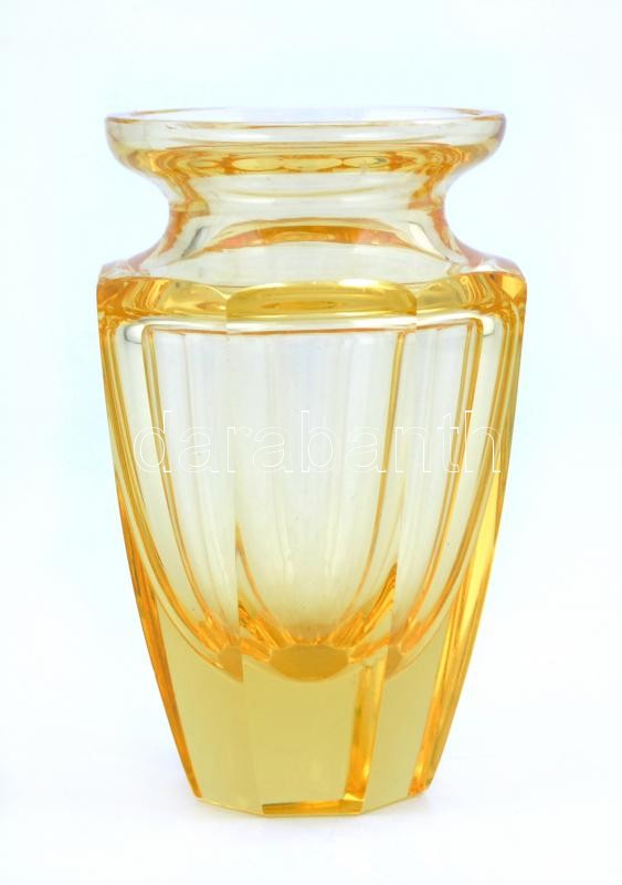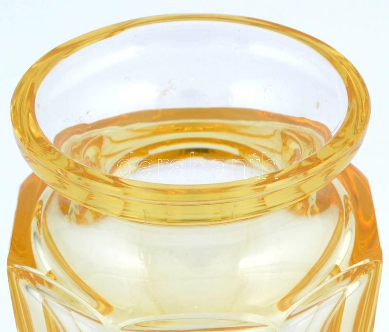 Moser borostyánsárga váza, formába öntött, jelzett, alján karcolásokka... https://www.darabanth.com/en/32-Major-auction/32.1/Porcelain-ceramics-glassware/Glass-objects~13352/Moser-borostyansarga-vaza-formaba-ontott-jelzett-aljan-karcolasokkal-m-12-5-cm-Moser-~II2036346