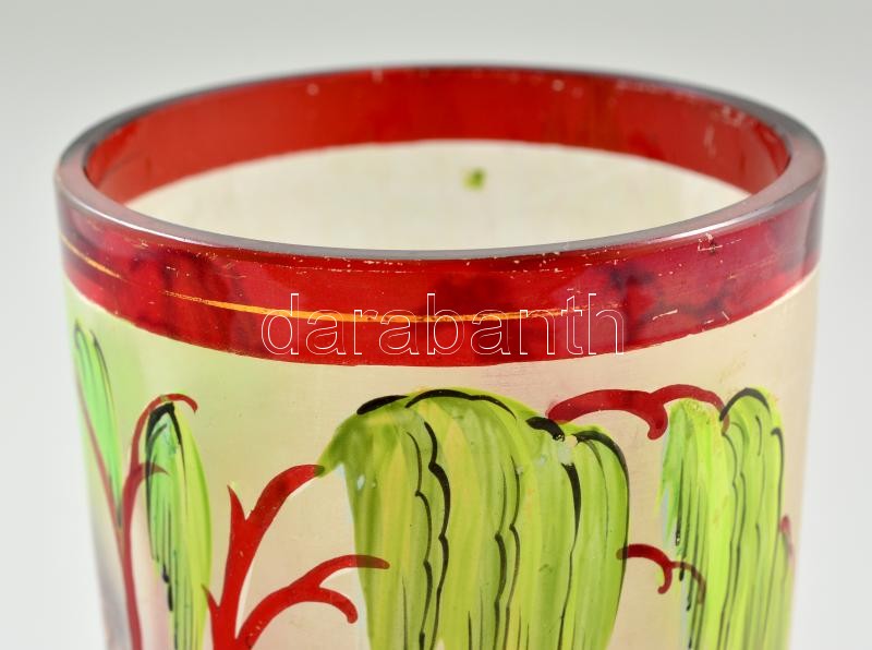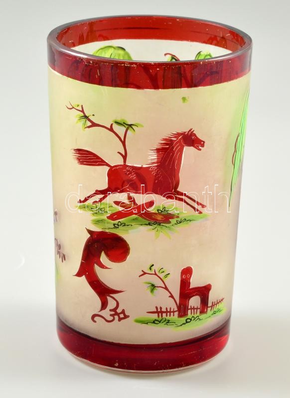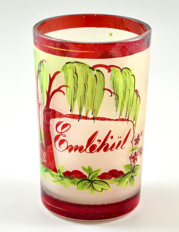 Description: cca 1900 címeres emlék pohár hengeres két rétegű színtelen üveg, maratott, rubinpác festéssel, "Emlékül" felirattal, kopott apró karcolásokkal,belső peremén nagyon apró csorbával, m:12 cm