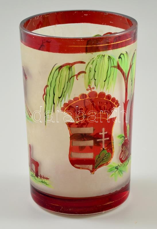 cca 1900 címeres emlék pohár hengeres két rétegű színtelen üveg, marat... https://www.darabanth.com/en/32-Major-auction/32.1/Porcelain-ceramics-glassware/Glass-objects~13352/cca-1900-cimeres-emlek-pohar-hengeres-ket-retegu-szintelen-uveg-maratott-rubinpac-festes~II1970063
